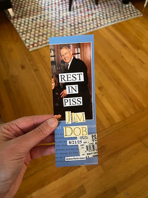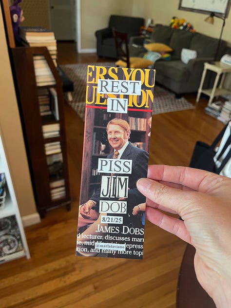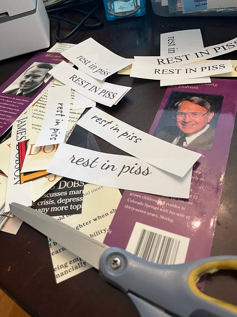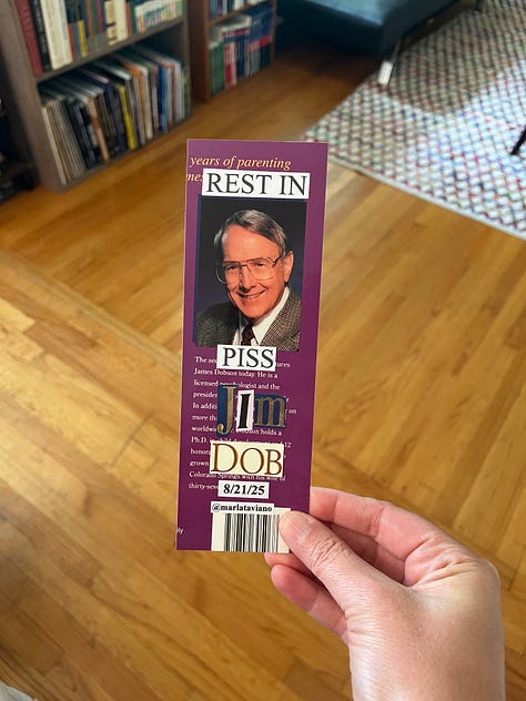 who writes extensively (with their partner, Krispin) about the harm James Dobson has caused (and continues to cause) on their substack: .I don’t have the time right now to write all about this man’s evil legacy because I AM MAKING BOOKMARKS.